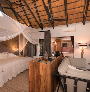 Imagina tres noches en el impresionante Mpala Jena, un oasis de lujo y aventura en el corazón del Parque Nacional de Zambezi, Zimbabue. Desde el momento descubrirás un mundo de maravillas naturales y experiencias emocionantes. Disfruta mientras navegas por las aguas del poderoso río Zambezi, contemplando vistas impresionantes y la posibilidad de avistar hipopótamos y cocodrilos en las orillas. Deleitate con cenas bajo las estrellas, saboreando delicias culinarias mientras escuchas los sonidos de la naturaleza que te rodea. Visita las majestuosas Cataratas Victoria, te dejarán sin aliento, con su cascada rugiente y su belleza natural incomparable. Durante tres noches, cada momento en Mpala Jena es un un momento mágico e inolvidable, una experiencia que te conecta con la grandeza de la naturaleza tan única de África. El suelo de arena en el área del bar, y la piscina adyacente, crean el escenario perfecto para relajarse descalzo después de un safari matutino o un crucero por el río.